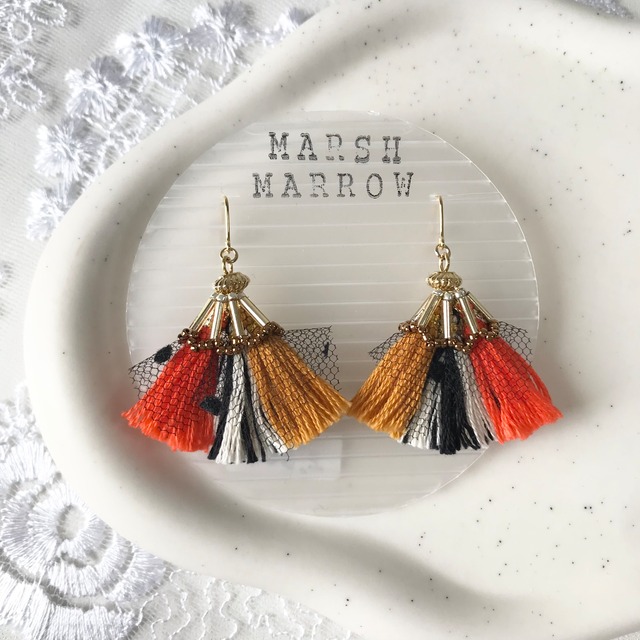 frilled pierce タッセル、チュール、ビーズでできたフリルのようなアクセサリー 色遊びが楽しい、小ぶりだけど存在感のあるデザインです ⭐︎ご希望の金具をオプションよりお選びください