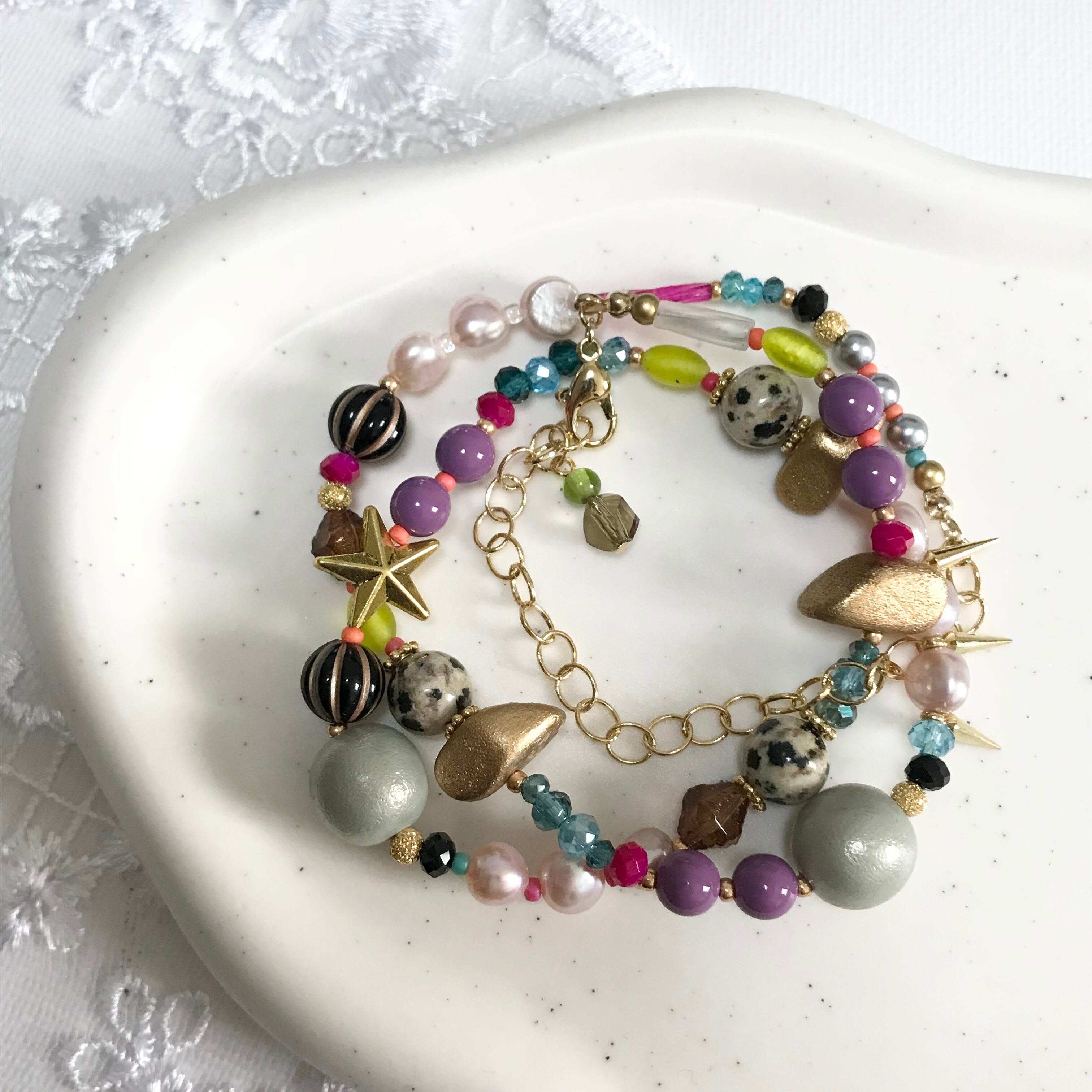 パール、天然石、ガラス、など色々なパーツがふんだんに使われたネックレスです。
