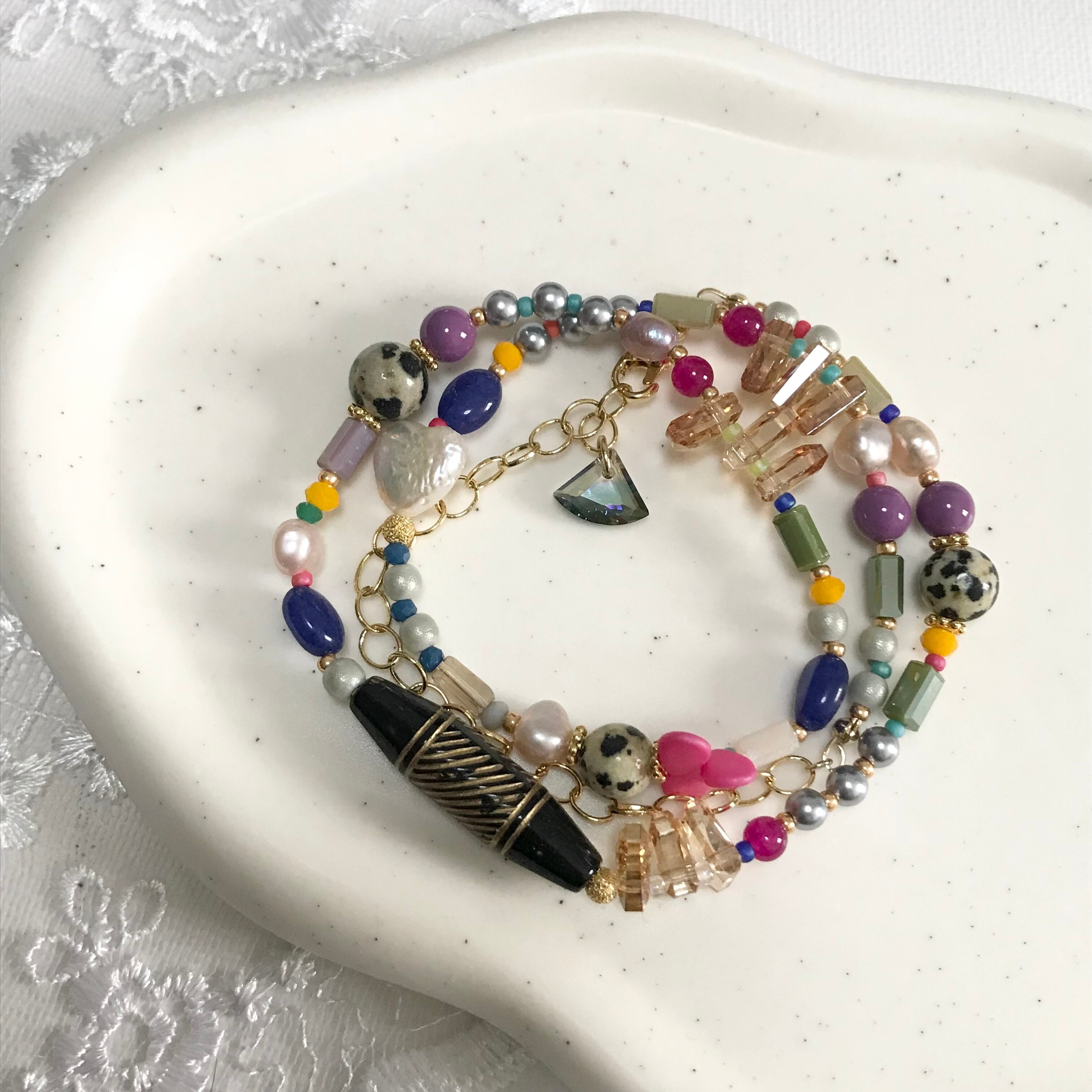 パール、天然石、ガラス、など色々なパーツがふんだんに使われたネックレスです。