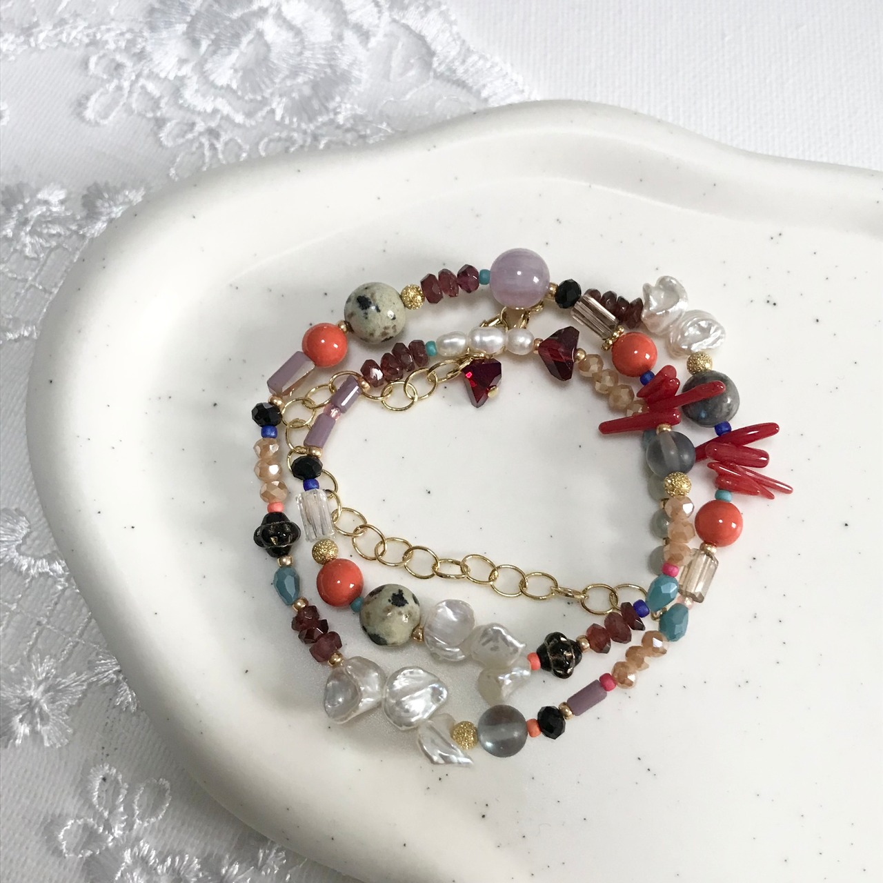 パール、天然石、ガラス、など色々なパーツがふんだんに使われたネックレスです。