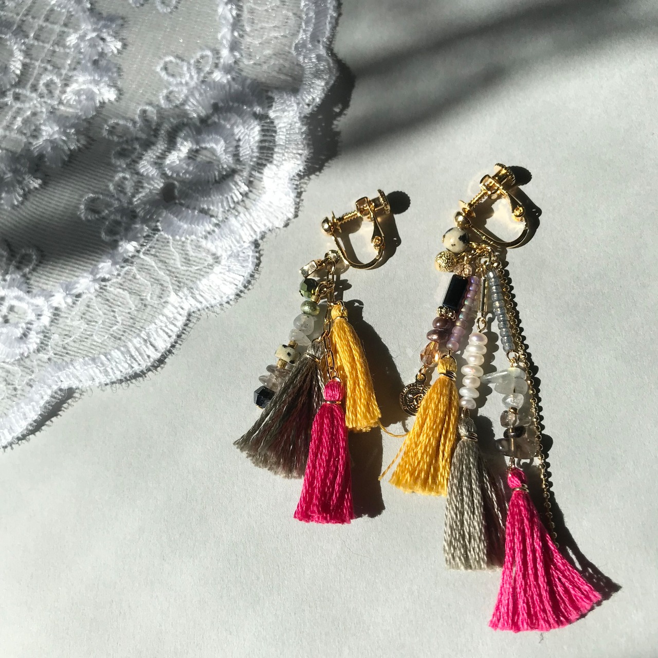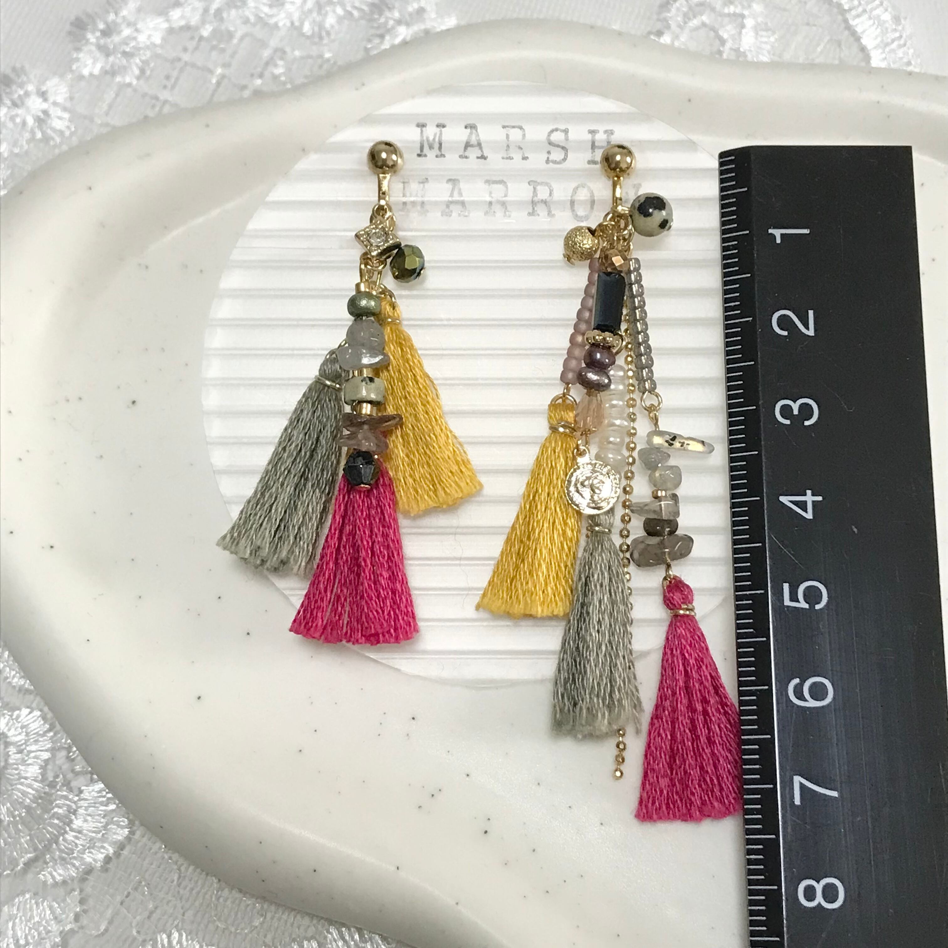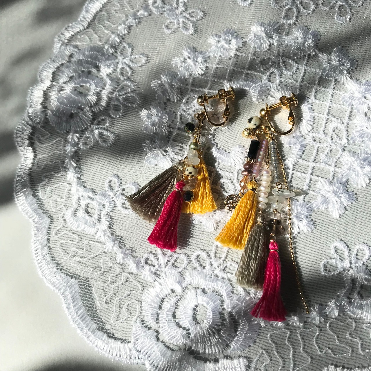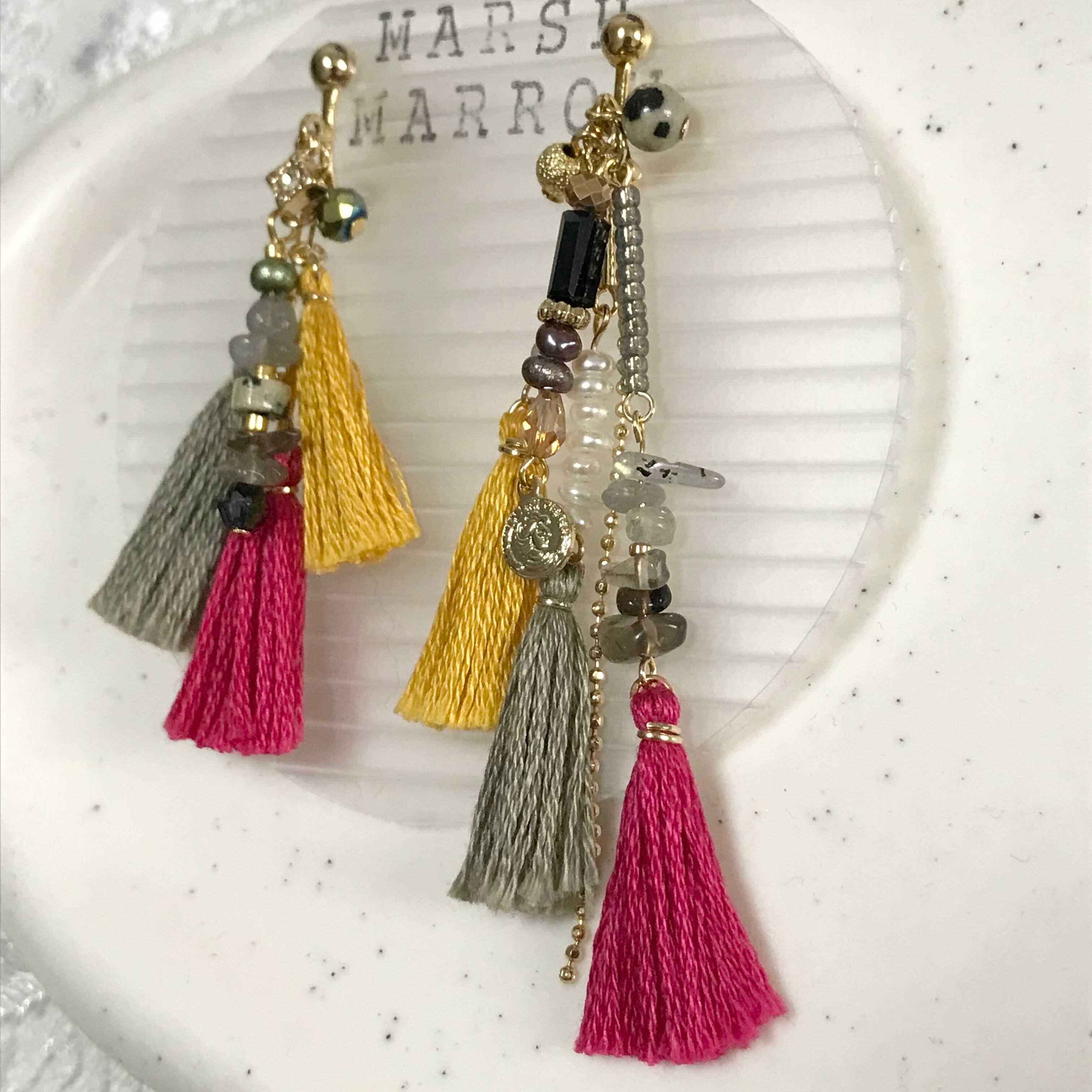 アシンメトリーで個性的、カラフルなタッセルもコーディネートのアクセントになります。