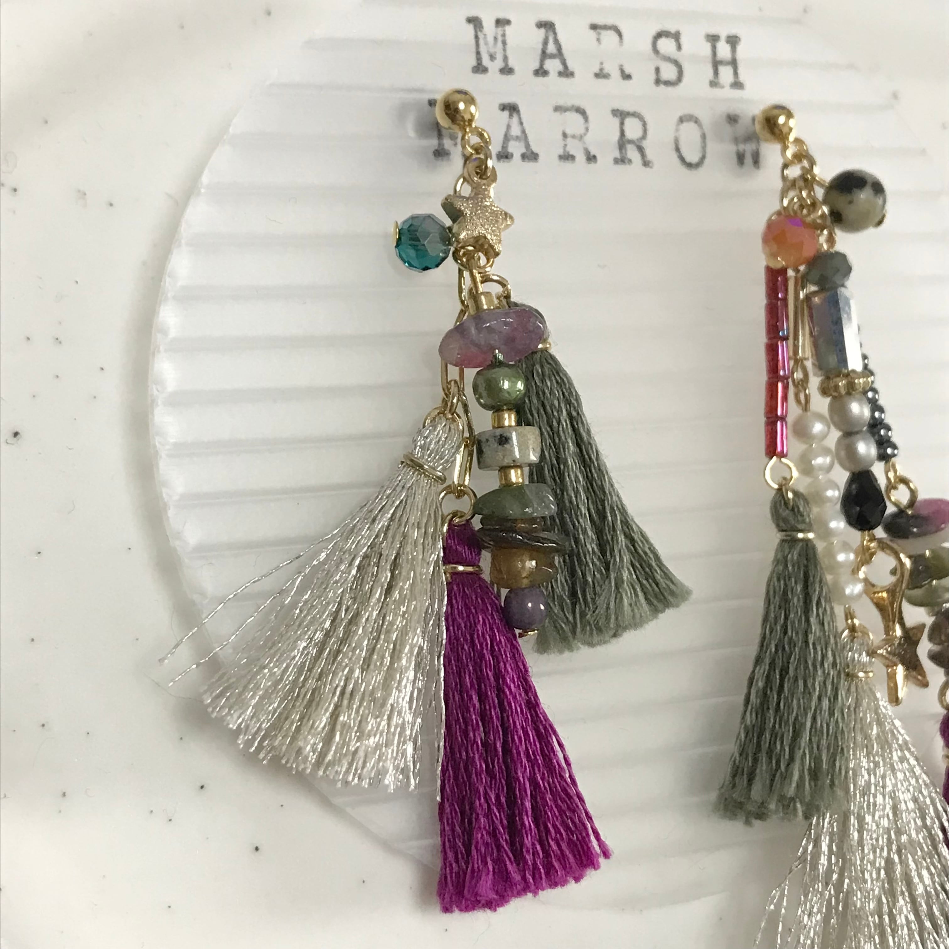 アシンメトリーで個性的、カラフルなタッセルもコーディネートのアクセントになります。