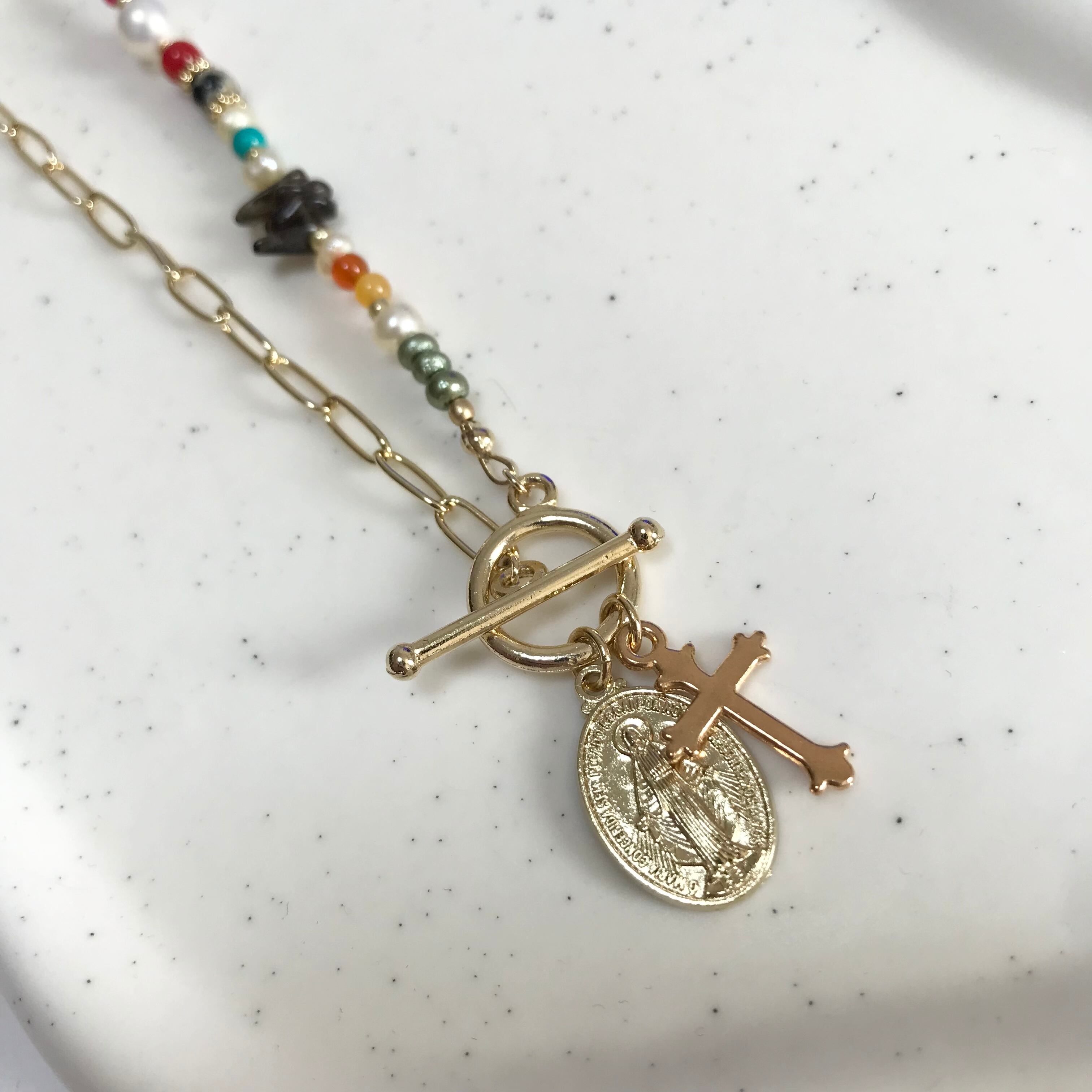 カラフルな天然石やガラスビーズ、淡水パールを組み合わせたネックレスです。