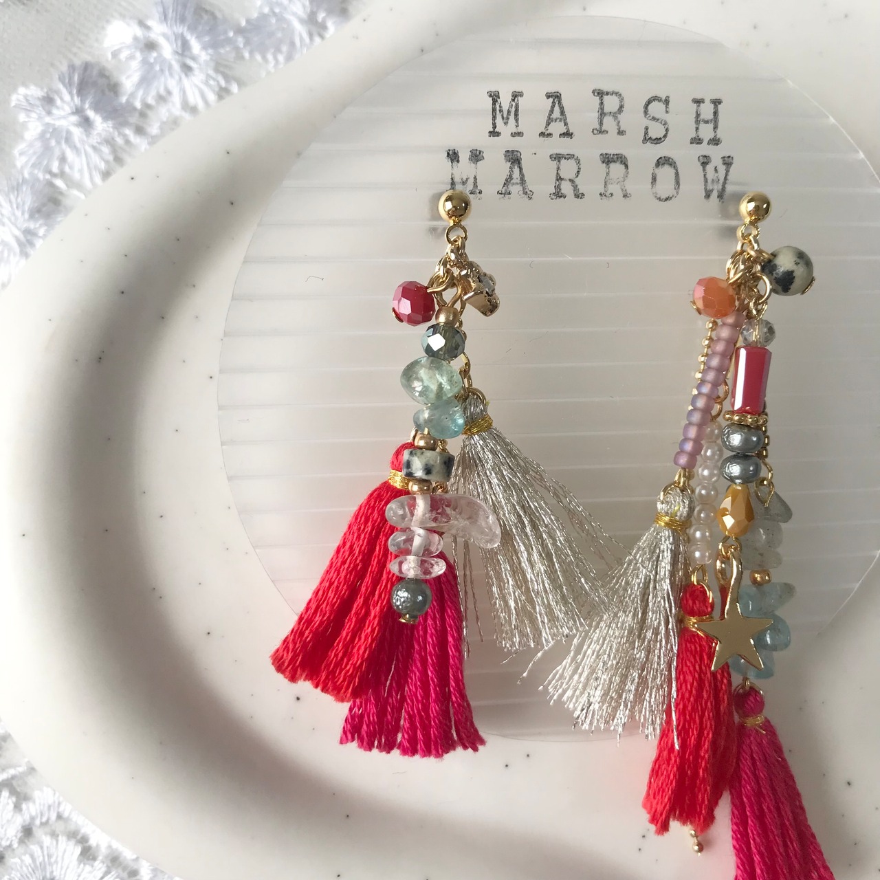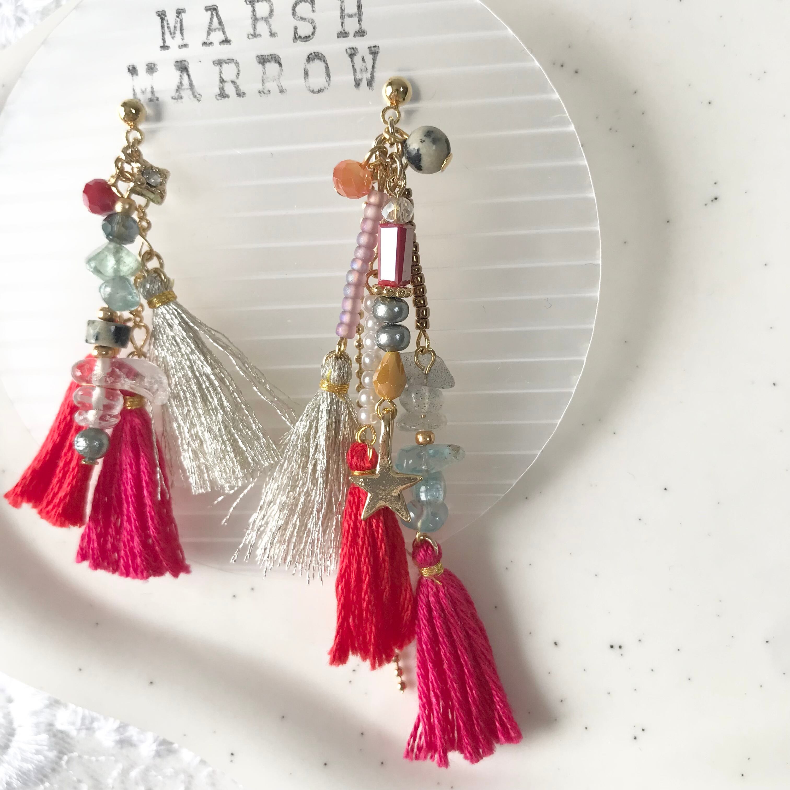 アシンメトリーで個性的、カラフルなタッセルもコーディネートのアクセントになります。