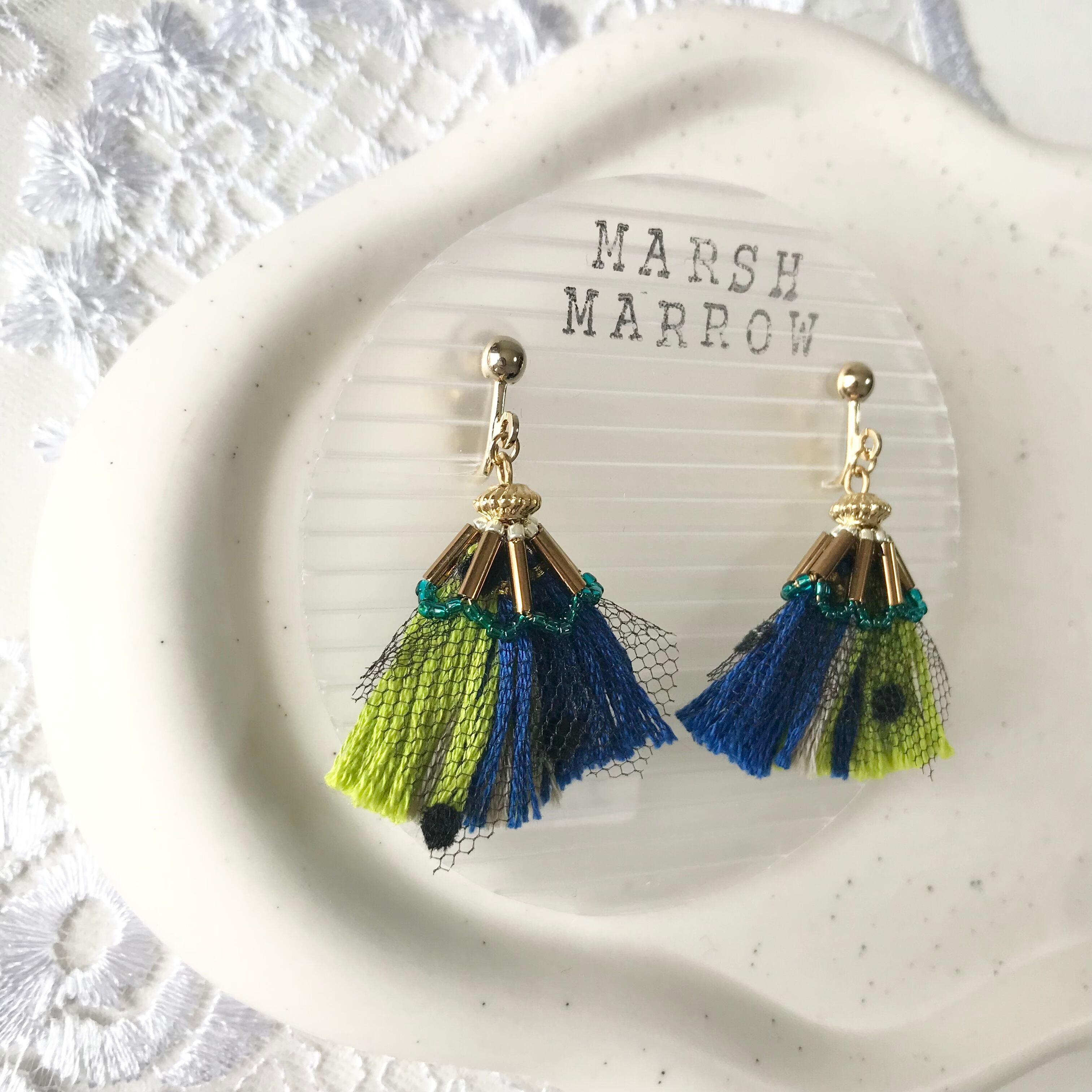 タッセル、チュール、ビーズでできたフリルのようなアクセサリー